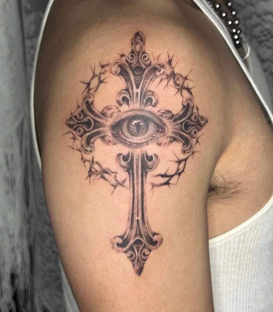 This upper arm tattoo features an intricately detailed gothic cross with an all-seeing eye at its center, surrounded by a crown of thorns. The ornate cross design combines sacred elegance with mystic symbolism, while the central eye adds a layer of protection, awareness, or divine watchfulness.