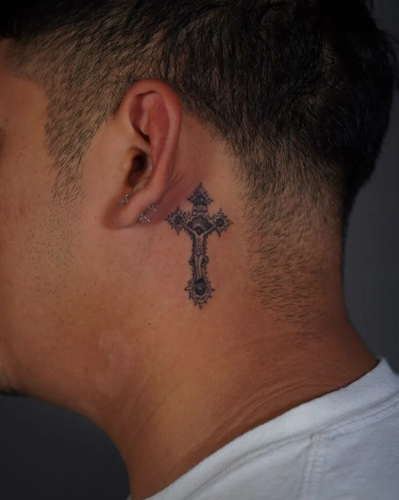 This compact yet detailed tattoo features an ornamental black cross placed just behind the ear. The gothic-inspired design is filled with intricate shading and pattern work, giving it an antique and sacred aesthetic despite its small size.
