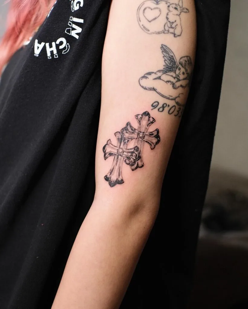 The doubled design adds visual interest while symbolizing duality, balance, or even shared faith between two people. Placed on the back of the arm, it stands out both artistically and symbolically. It’s a bold choice for someone drawn to traditional symbols with a modern twist.