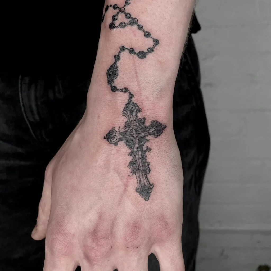 This tattoo displays a beautifully worn-looking rosary with an ornate cross draped across the back of the hand and wrist. The rosary beads flow naturally along the wrist’s contour, while the cross features intricate detailing and a textured, almost antique appearance.