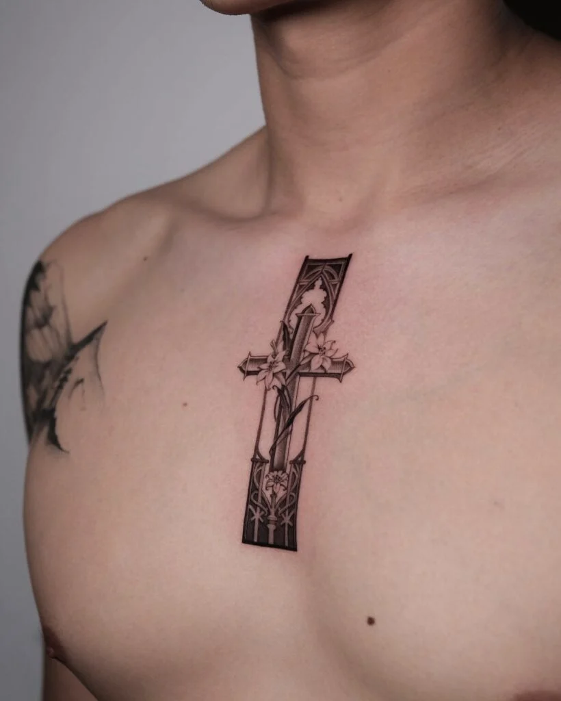 This elegant chest tattoo features a tall, stylized cross adorned with delicate lily flowers and intricate architectural detailing. The floral elements wind gracefully around the cross, symbolizing purity and renewal, while the pointed arches and gothic-inspired lines evoke a sacred, cathedral-like presence.