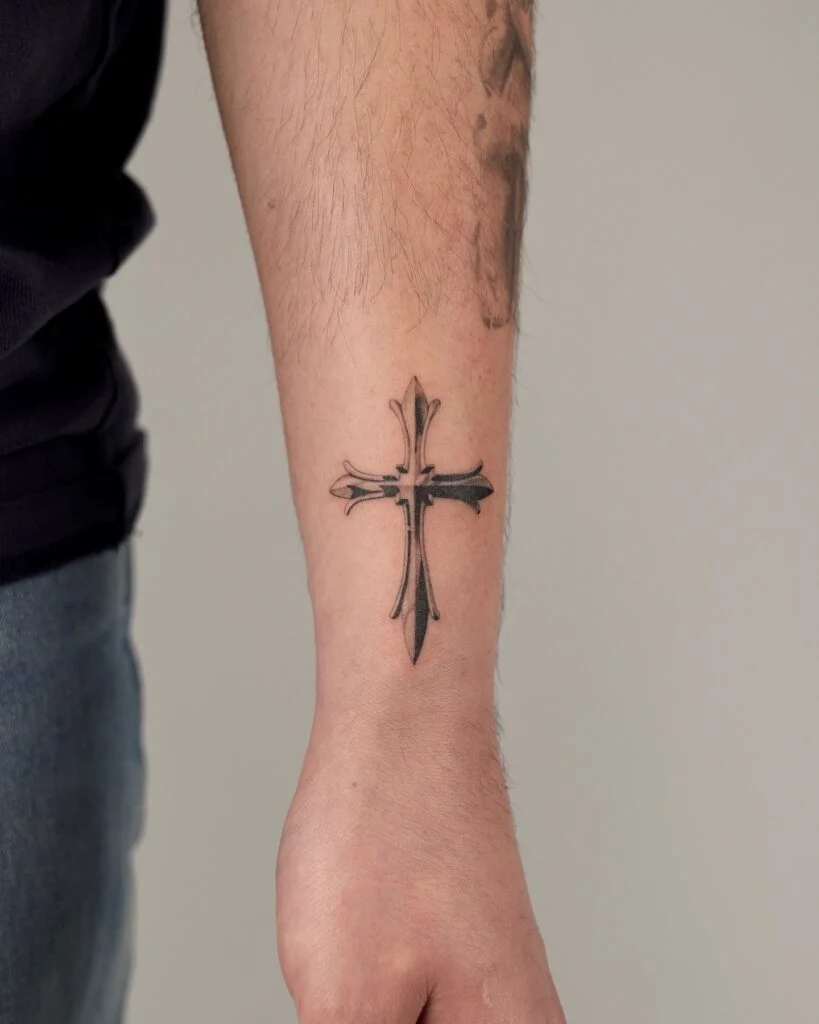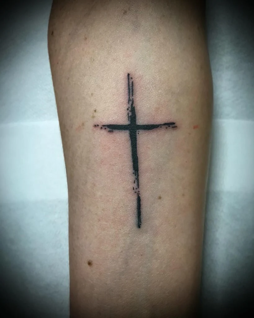 This forearm tattoo features a rough, sketch-like black cross with expressive brushstroke details and a slightly fragmented top. Its bold, grungy look gives off an edgy, rebellious vibe while still carrying the symbol’s traditional meaning of faith and sacrifice.