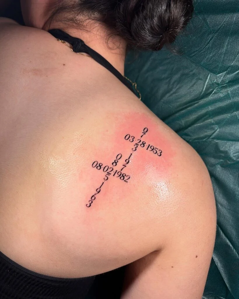 This upper back tattoo transforms a traditional cross into a deeply personal tribute by using dates and numbers to form its shape. At the center, a significant date is highlighted, while surrounding numbers—likely representing birthdates or memorial dates—radiate vertically and horizontally to complete the cross.