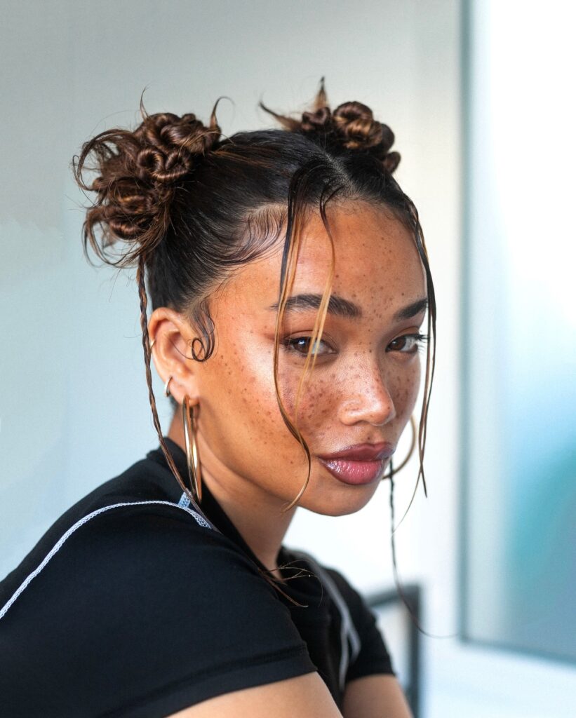 This twisted space buns hairstyle blends playful energy with modern edge. Two twisted buns sit high on each side, giving the look a fun and youthful vibe. The sleek, polished base contrasts nicely with the textured buns, adding dimension.