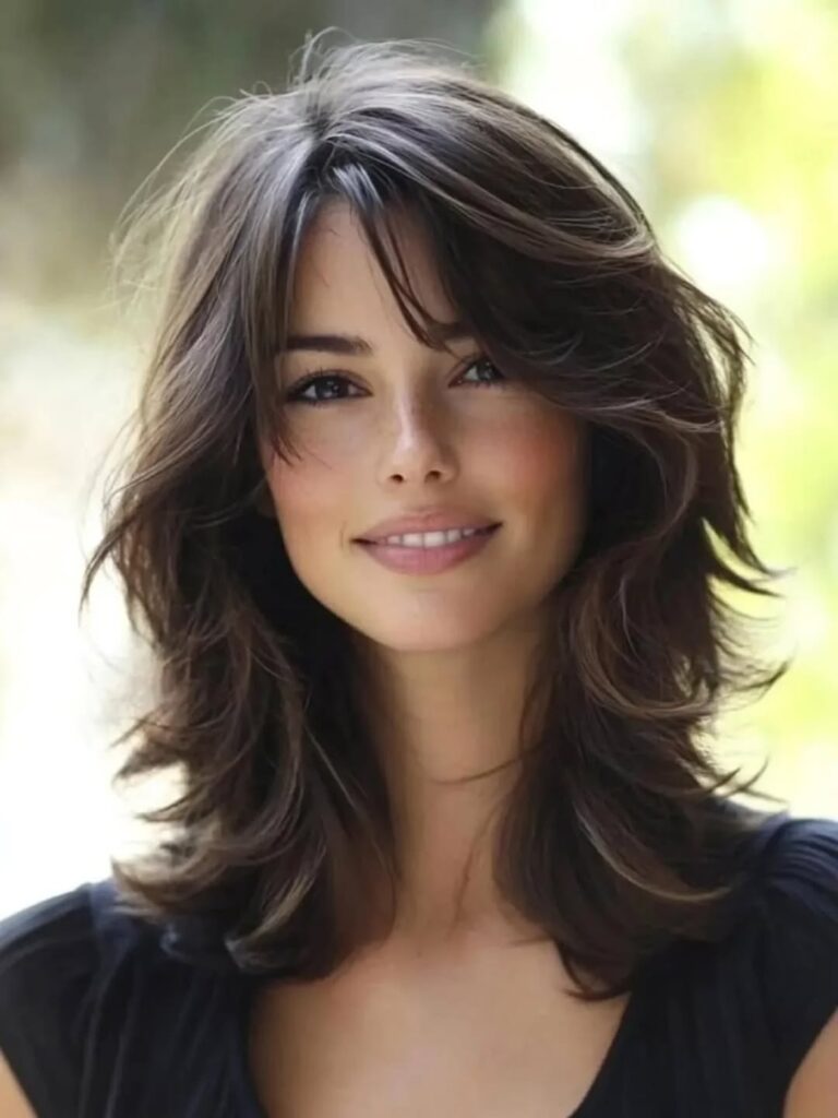 This medium layered hairstyle with curtain bangs offers soft movement and a naturally flattering shape. The feathered layers frame the face beautifully, adding light volume and texture without heaviness. The curtain bangs blend seamlessly into the sides, creating a smooth transition that highlights the eyes and cheekbones.