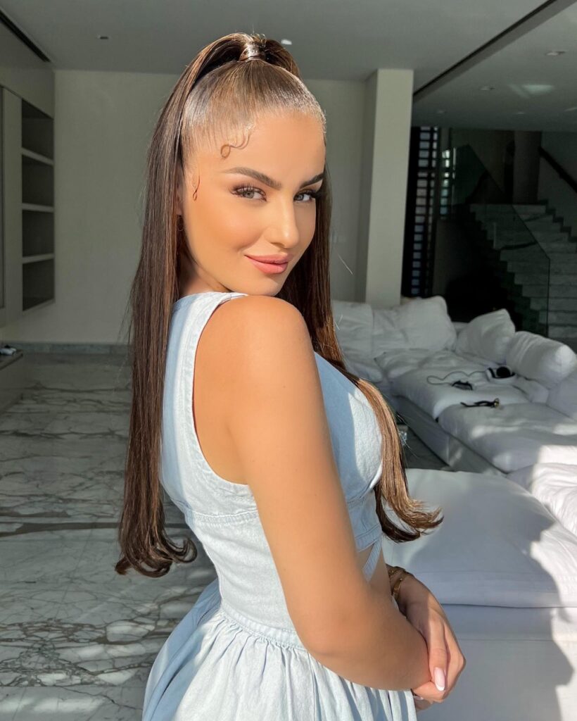 This sleek high ponytail hairstyle gives a polished and confident look. The hair is pulled tightly upward, creating a smooth, shiny finish that accentuates facial features. A single strand wraps around the base, hiding the tie and adding a refined touch.