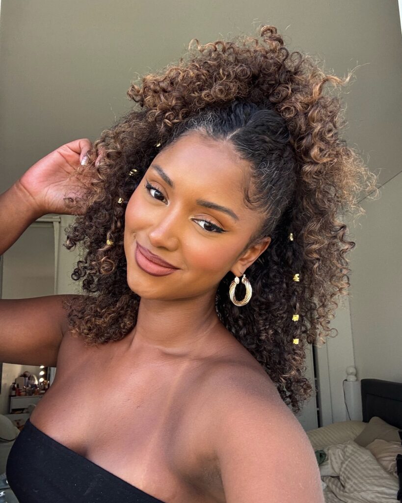 Gold hair cuffs are scattered throughout, adding a touch of sparkle and personality. The sleek center part contrasts perfectly with the fluffy curls, giving the look balance and polish. It’s a fun, stylish hairstyle that highlights natural curls while staying elegant and easy to wear anywhere.