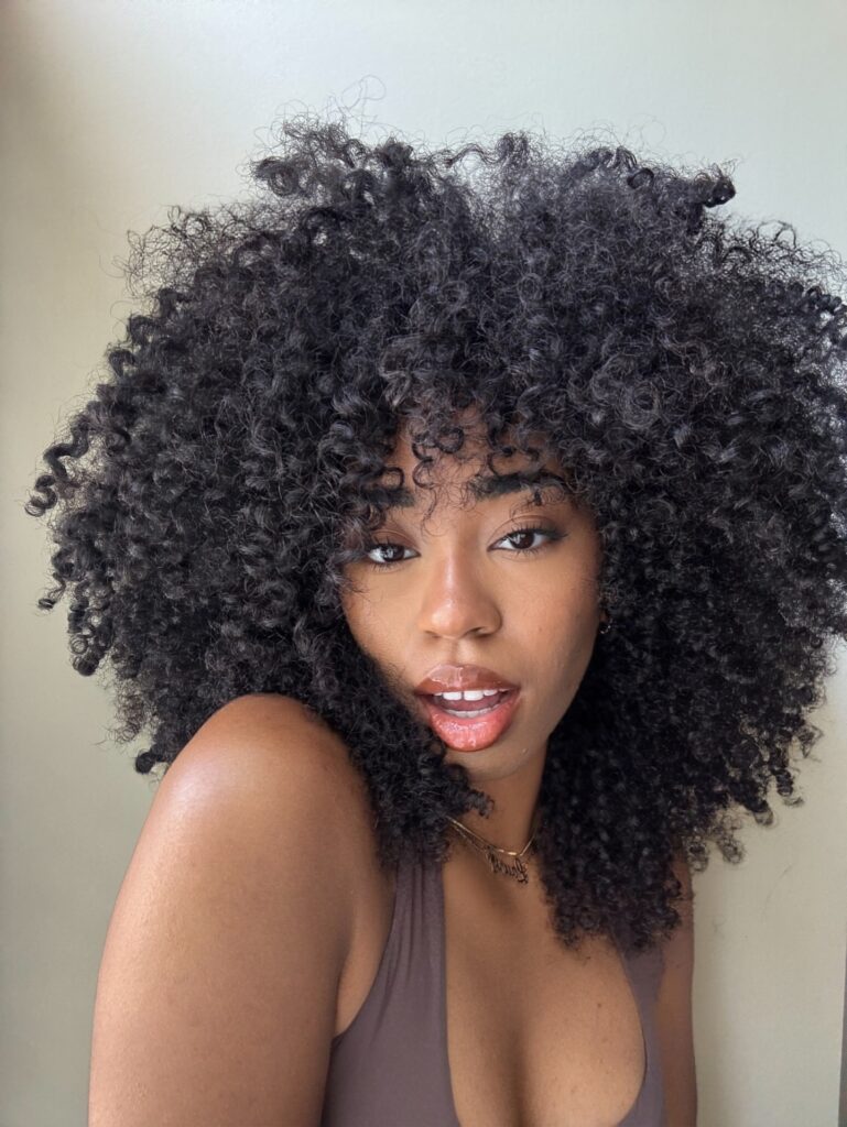 Subtle bangs fall gently over the forehead, adding charm and balance. This hairstyle celebrates natural texture with confidence and grace, requiring only moisture and care to maintain its bounce and shine. It’s expressive, empowering, and beautifully timeless.