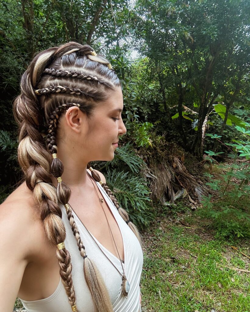Gold hair cuffs accent the braids, giving the look a bold, decorative touch. It’s an adventurous yet feminine hairstyle that stands out effortlessly, perfect for festivals, outdoor events, or bold everyday wear.