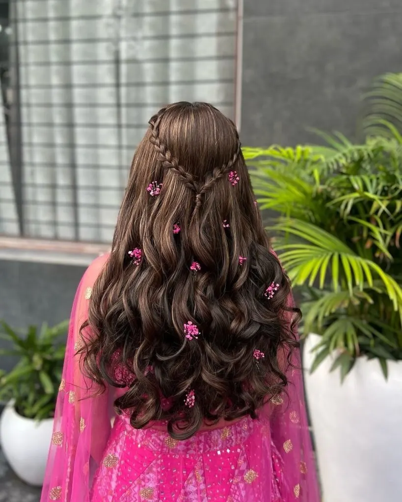 Tiny pink flowers are scattered throughout the curls, bringing a playful and graceful touch. The combination of loose waves and floral accents makes this style perfect for weddings, festive events, or outdoor celebrations. It’s a simple yet eye-catching hairstyle that radiates youthful beauty and confidence.