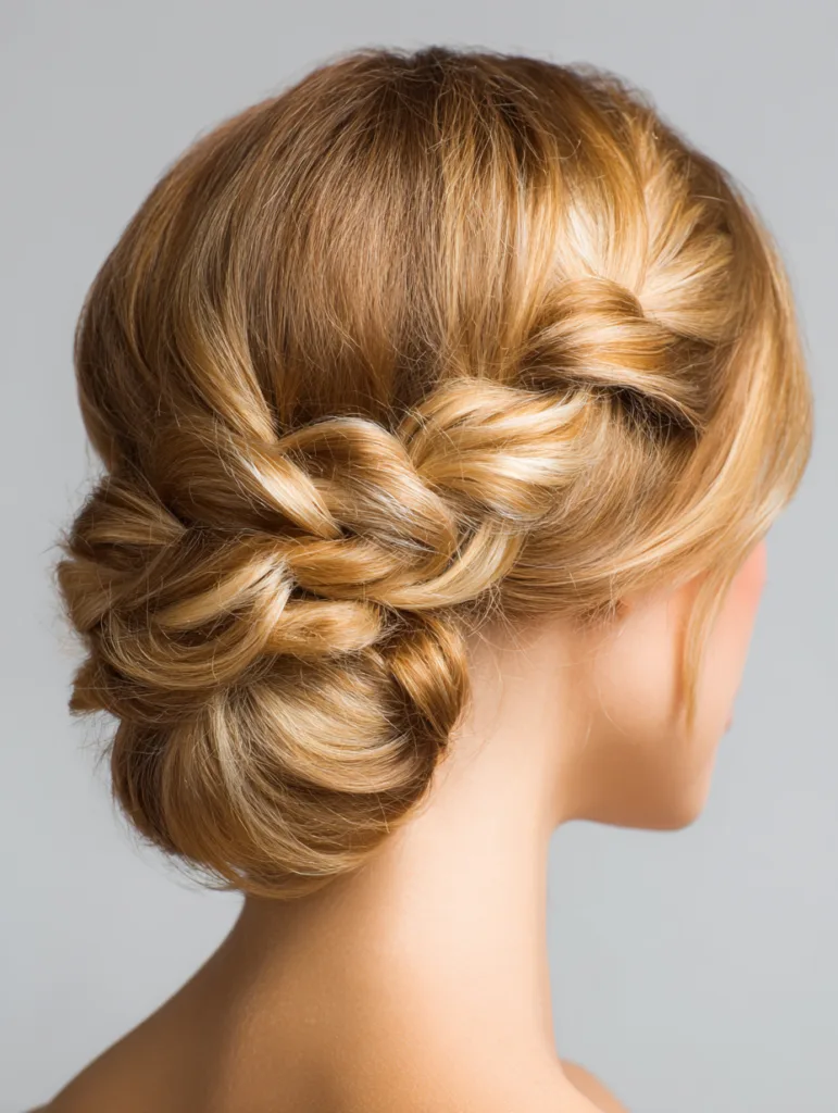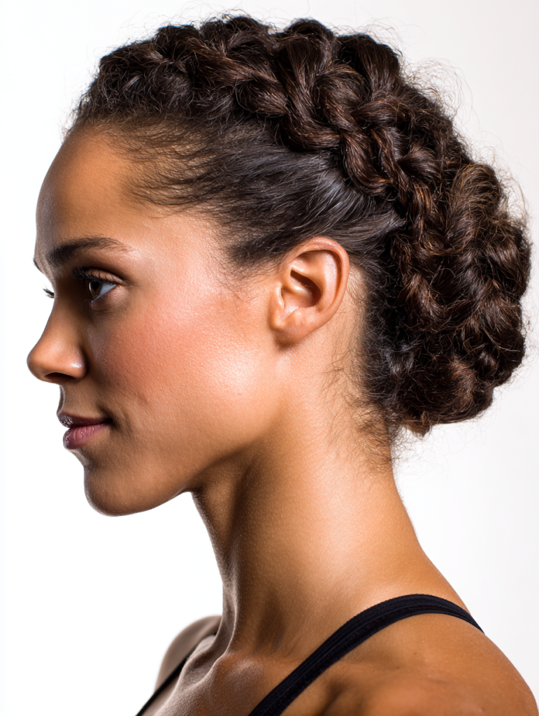 This style works for medium or long hair and suits all textures because the braid anchors volume firmly. It feels balanced on the head and reduces pressure from heavy strands. Use a firm elastic and a few pins to secure the bun so it lasts through extended play.