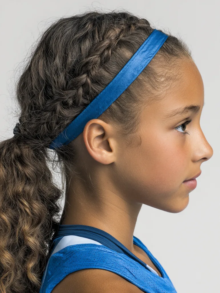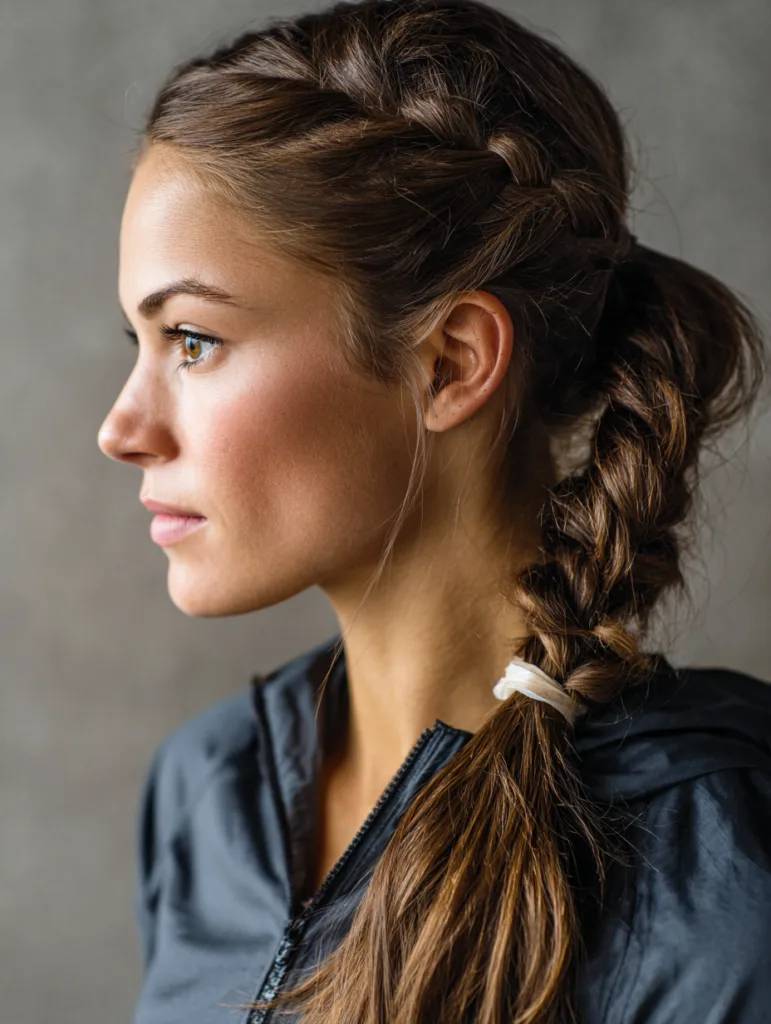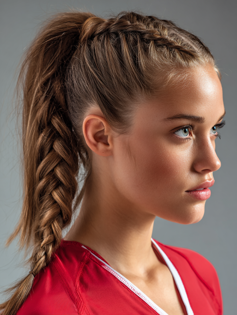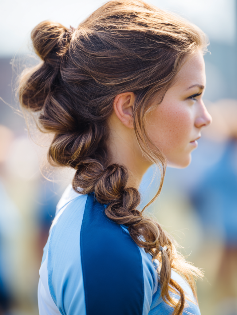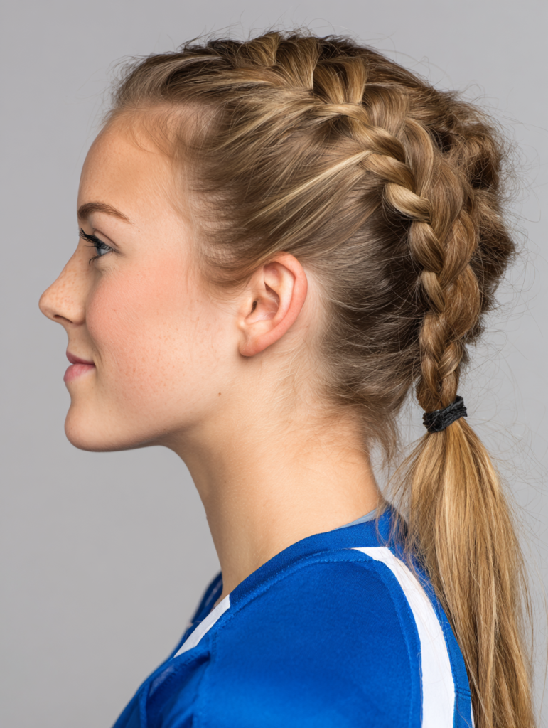 This style works for medium or long lengths and suits all hair types because it distributes weight evenly. It stays reliable during sweat-heavy games since the braid resists slipping. Use a tight elastic at the end to maintain structure and keep the style stable.