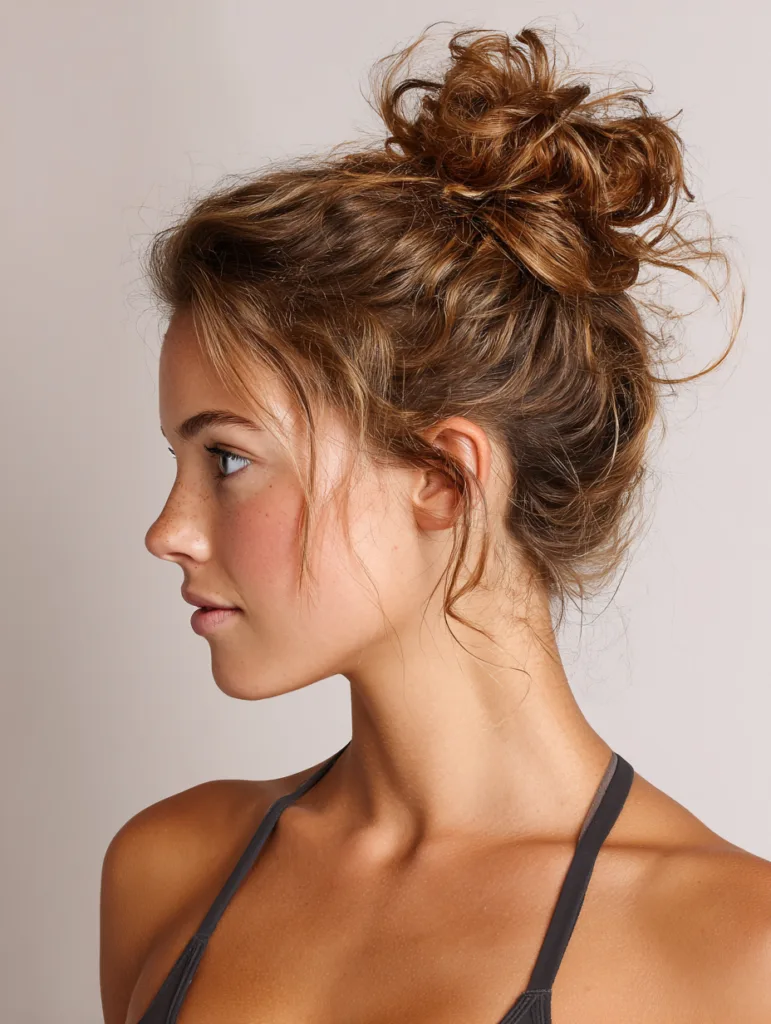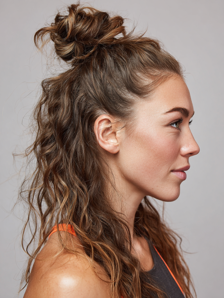 Wavy and curly textures benefit because natural volume helps the bun stay firm. The bun keeps the neck cool and clear for intense movement. Use a tight elastic and a few pins to stabilize it during long rallies.