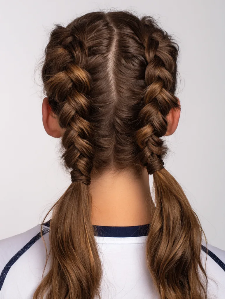 Double French braids into a ponytail help players maintain controlled volume while keeping hair secure during fast-paced matches. The braids distribute tension evenly, which improves comfort during long sessions. This style works for medium or long hair and suits all textures because braids resist slipping.