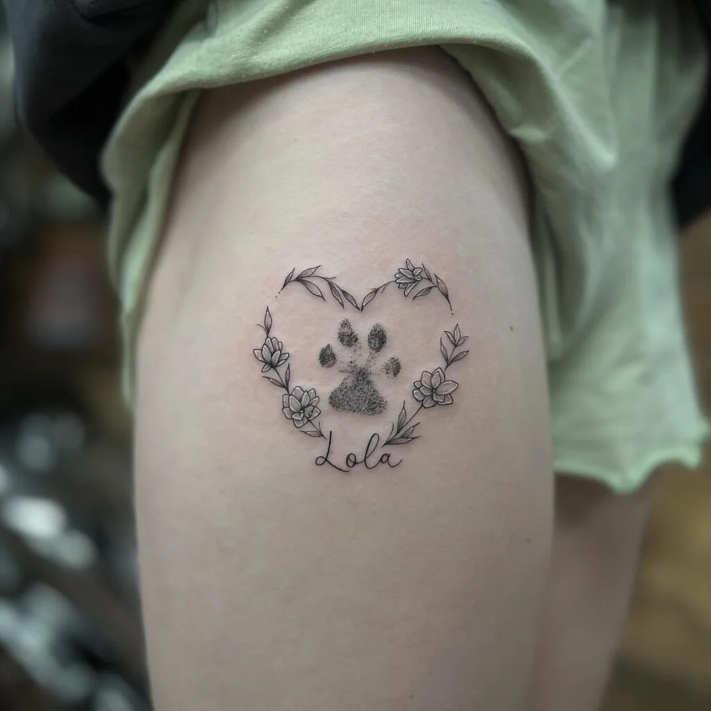 This delicate memorial tattoo features a realistic paw print at the center, framed by a heart-shaped floral design and the name “Lola” written below. The soft flowers and leaves create a peaceful and graceful tribute to a beloved pet, while the paw print keeps the memory of their unique presence alive.