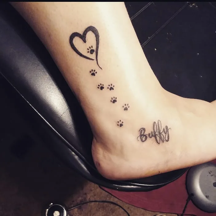 This heartfelt memorial tattoo features a trail of small paw prints leading up to a heart that incorporates a larger paw print inside it. The design is completed with the name adding a personal touch to the tribute.