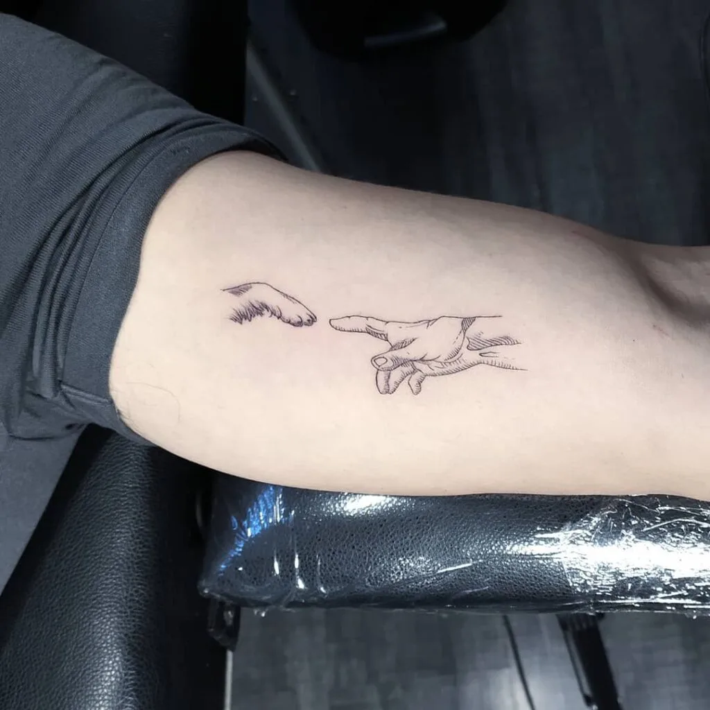 This touching memorial tattoo showcases the bond between a pet and its owner through a simple line drawing of a human hand gently holding a pet’s paw. The design symbolizes trust, love, and companionship, serving as a lasting tribute to a beloved pet.