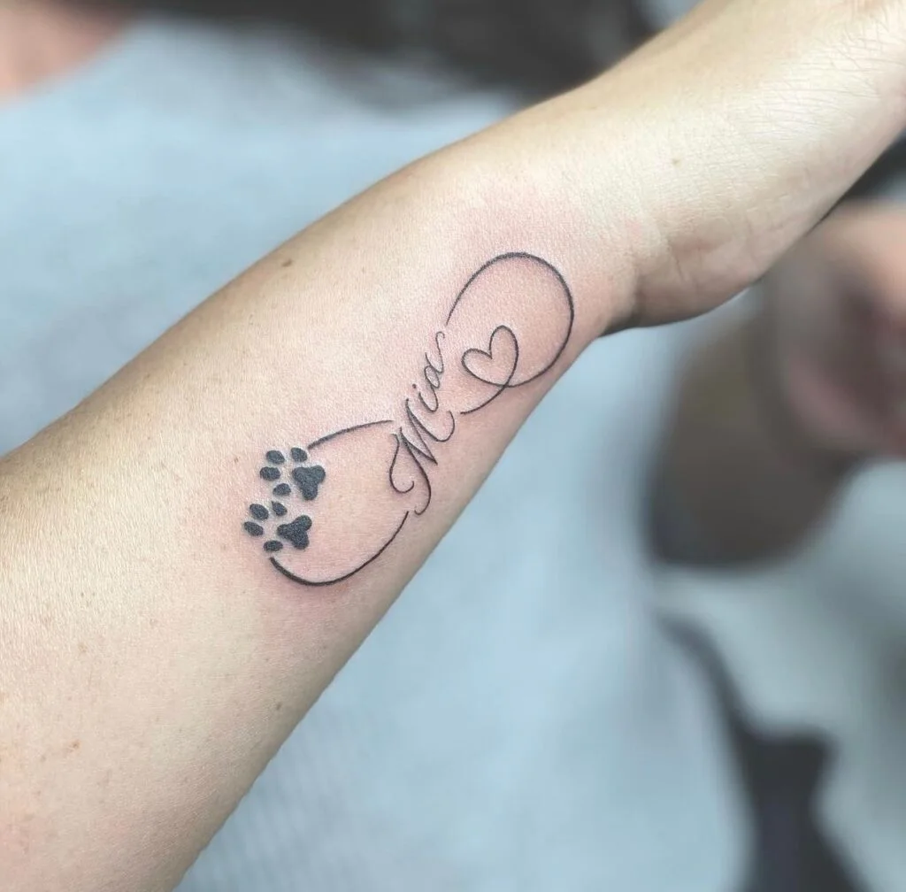 This beautiful memorial tattoo features an infinity symbol with paw prints on one side and the name “Mia” elegantly scripted on the other, along with a small heart. The infinity symbol represents the eternal bond and love shared with the pet, signifying that their memory will last forever.