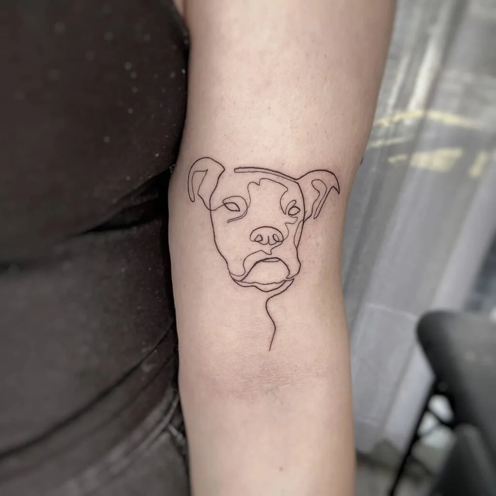 This minimalist tattoo features a simple yet expressive line drawing of a dog’s face. The continuous, flowing line captures the dog’s unique features in an abstract but recognizable way, representing the essence of the pet’s personality.