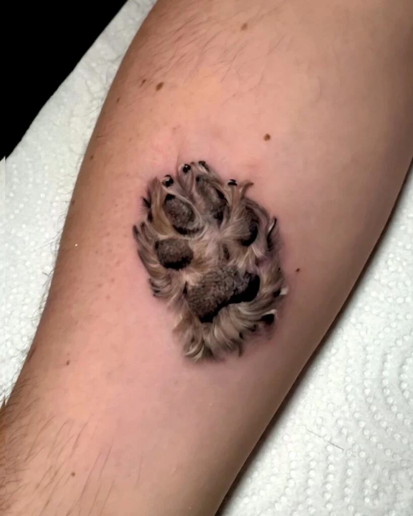 This lifelike pet memorial tattoo captures a detailed paw print, complete with fur textures and shading, making it feel as if the paw has been imprinted directly on the skin. The hyper-realistic design emphasizes the pet’s individuality and serves as a lasting tribute to the bond shared.