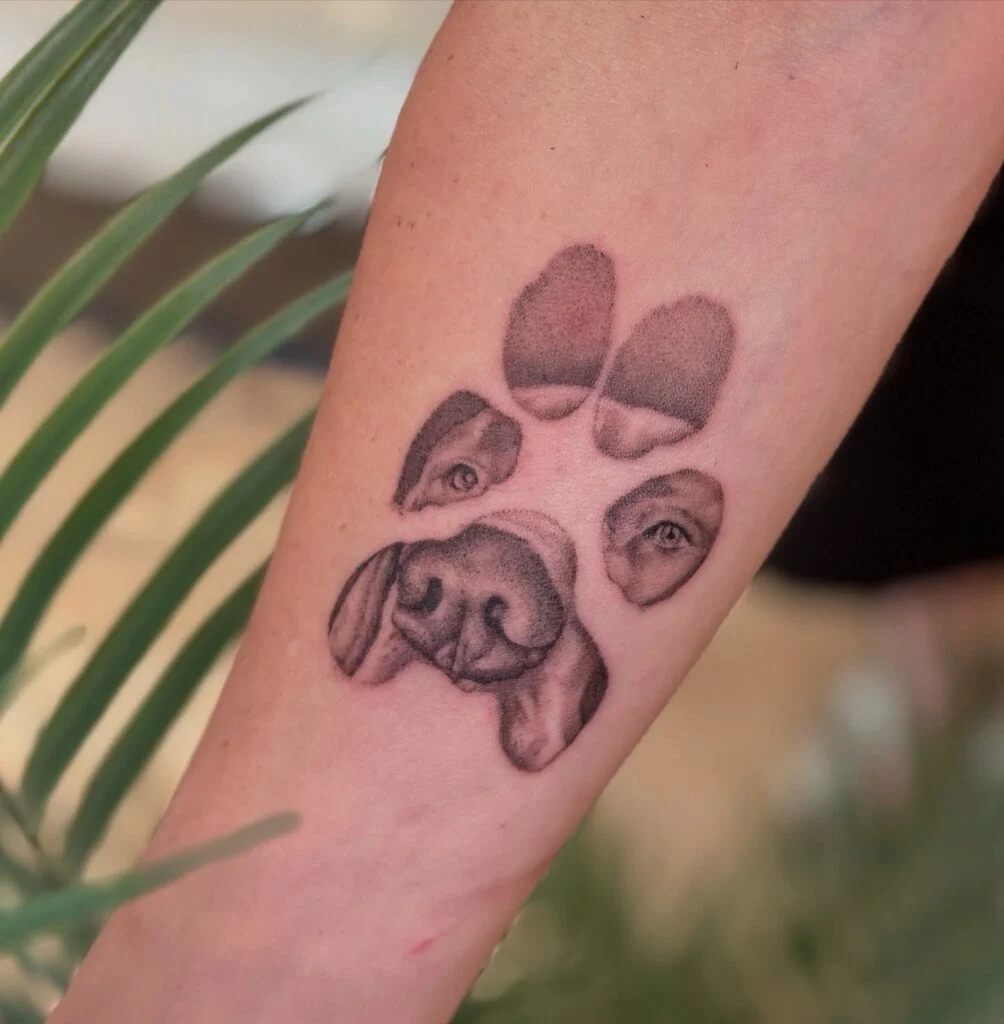 This tattoo blends a dog’s portrait into the shape of a pawprint, with each pad containing a different facial feature. The top pads are softly shaded, while the lower ones highlight the dog’s soulful eyes and detailed snout.