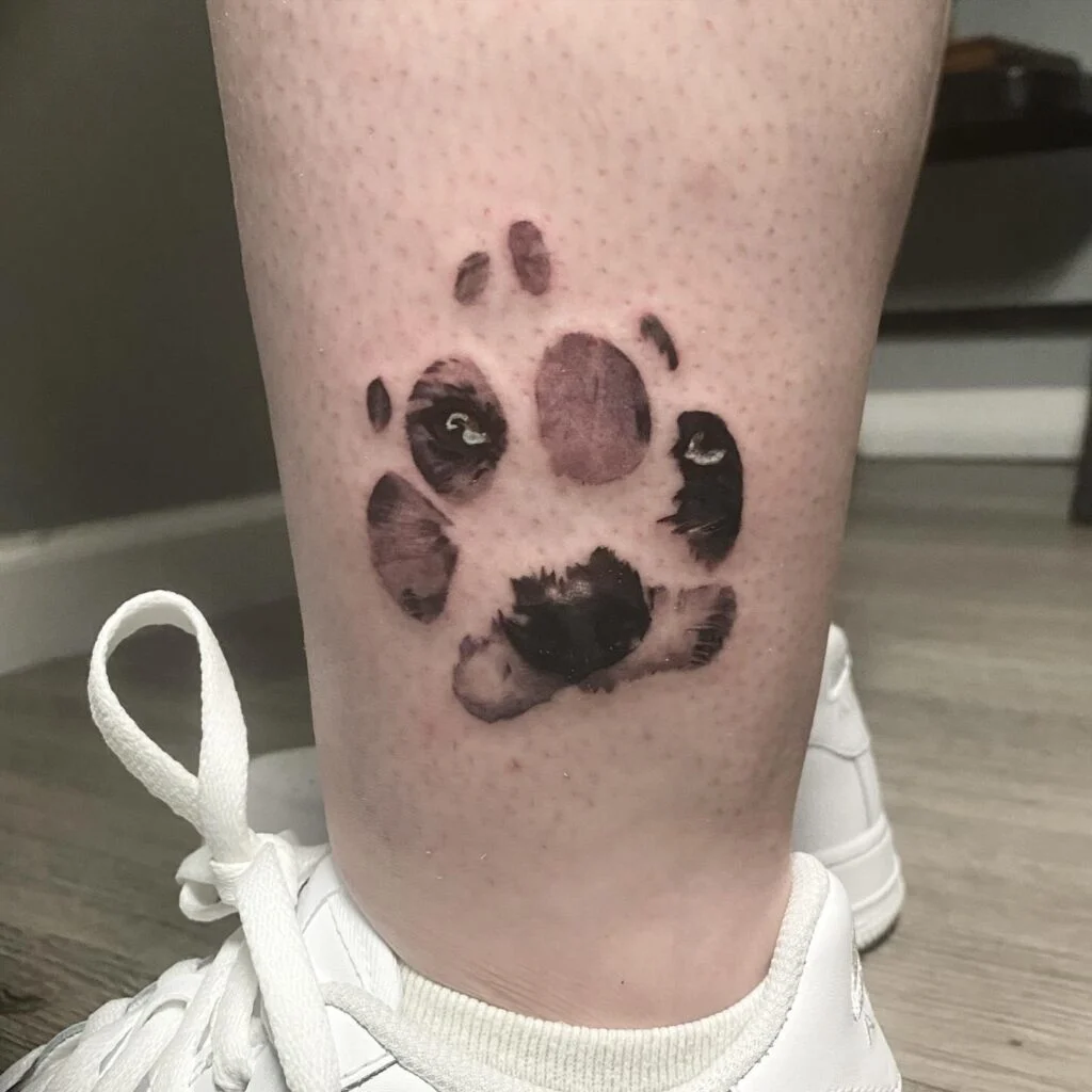 This tattoo features a creative pawprint design that incorporates a dog’s eyes and nose within its pads. The dog’s expressive gaze peers out from two of the upper pads, while the nose and snout are subtly blended into the lower section.