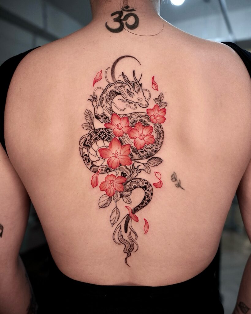 This stunning back tattoo features a beautifully detailed dragon intertwined with vivid red flowers and delicate leaves. The dragon’s sleek form wraps around the blossoms, blending strength and grace in perfect harmony. The contrast between the dark ink and the red petals creates a captivating balance of power and femininity.