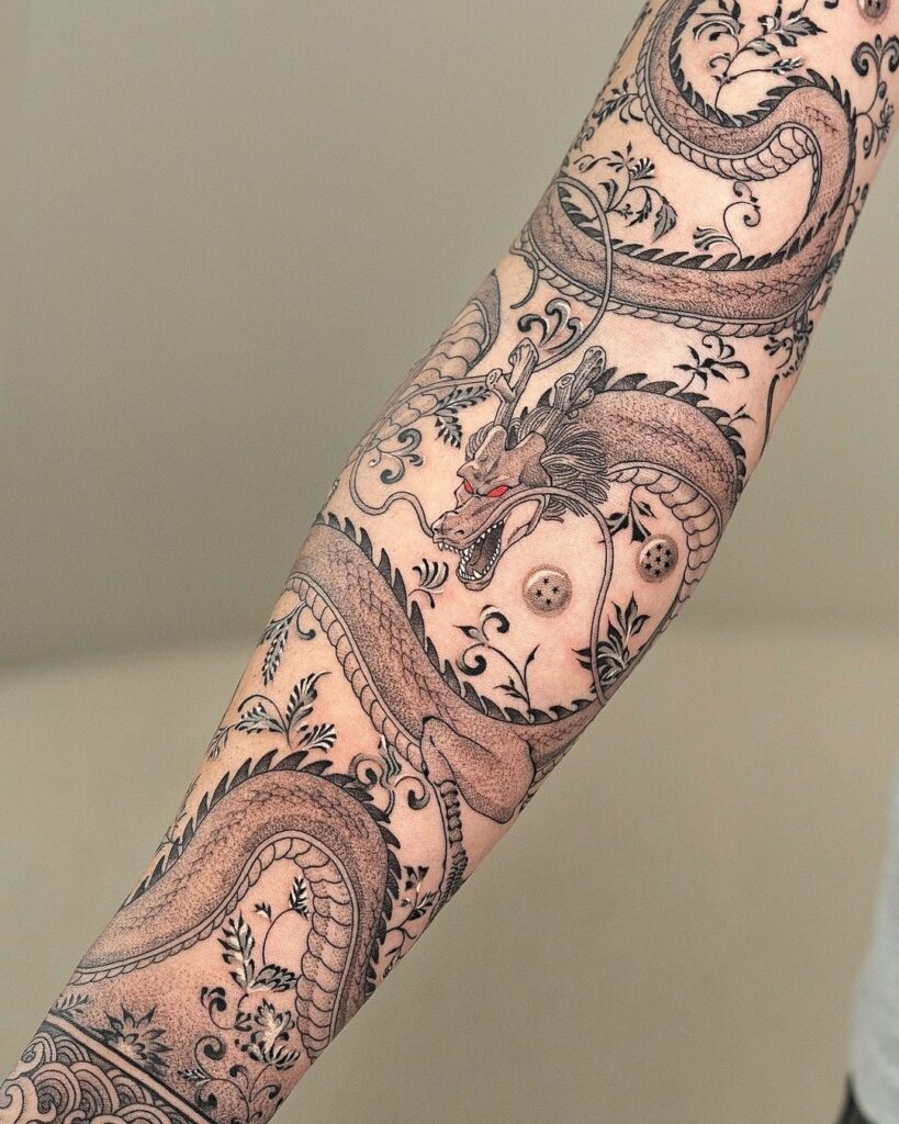 This forearm tattoo showcases a detailed dragon winding through elegant floral patterns, blending traditional strength with refined artistry. The dragon’s fierce expression and glowing red eyes add intensity, while the ornamental foliage softens the overall look.
