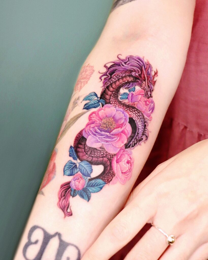 This breathtaking forearm tattoo features a purple dragon intertwined with vibrant pink and lavender flowers. The detailed scales contrast beautifully with the soft petals, blending fierce energy with gentle elegance. Shades of blue and magenta bring the design to life, giving it a dreamy, artistic appeal.