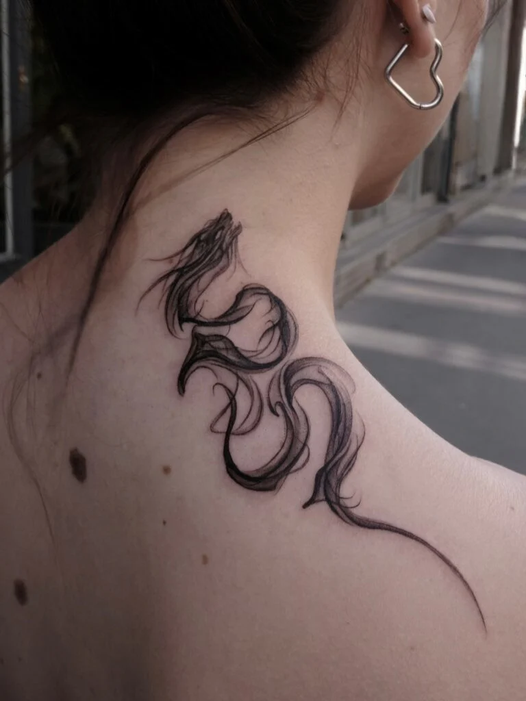 This back tattoo features a graceful dragon drawn with soft, smoky strokes that flow down the spine. The design combines elegance and power, showing the dragon’s head curving forward as its tail fades into wispy lines.