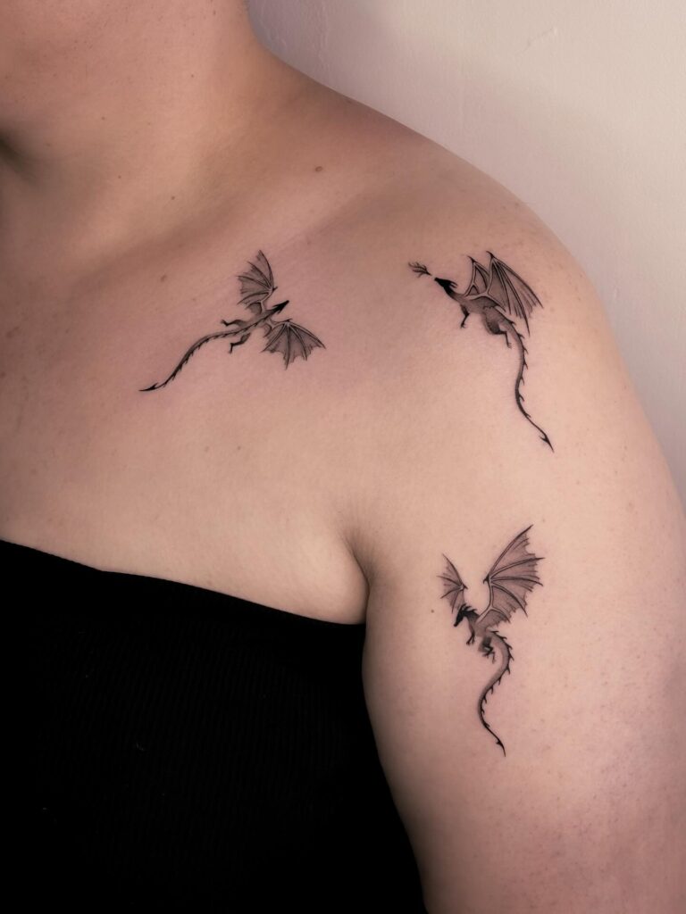 This tattoo features three small dragons in flight across the shoulder and upper arm, creating a lively, graceful composition. Each dragon is finely detailed, with delicate wings and slender bodies that flow naturally along the skin.