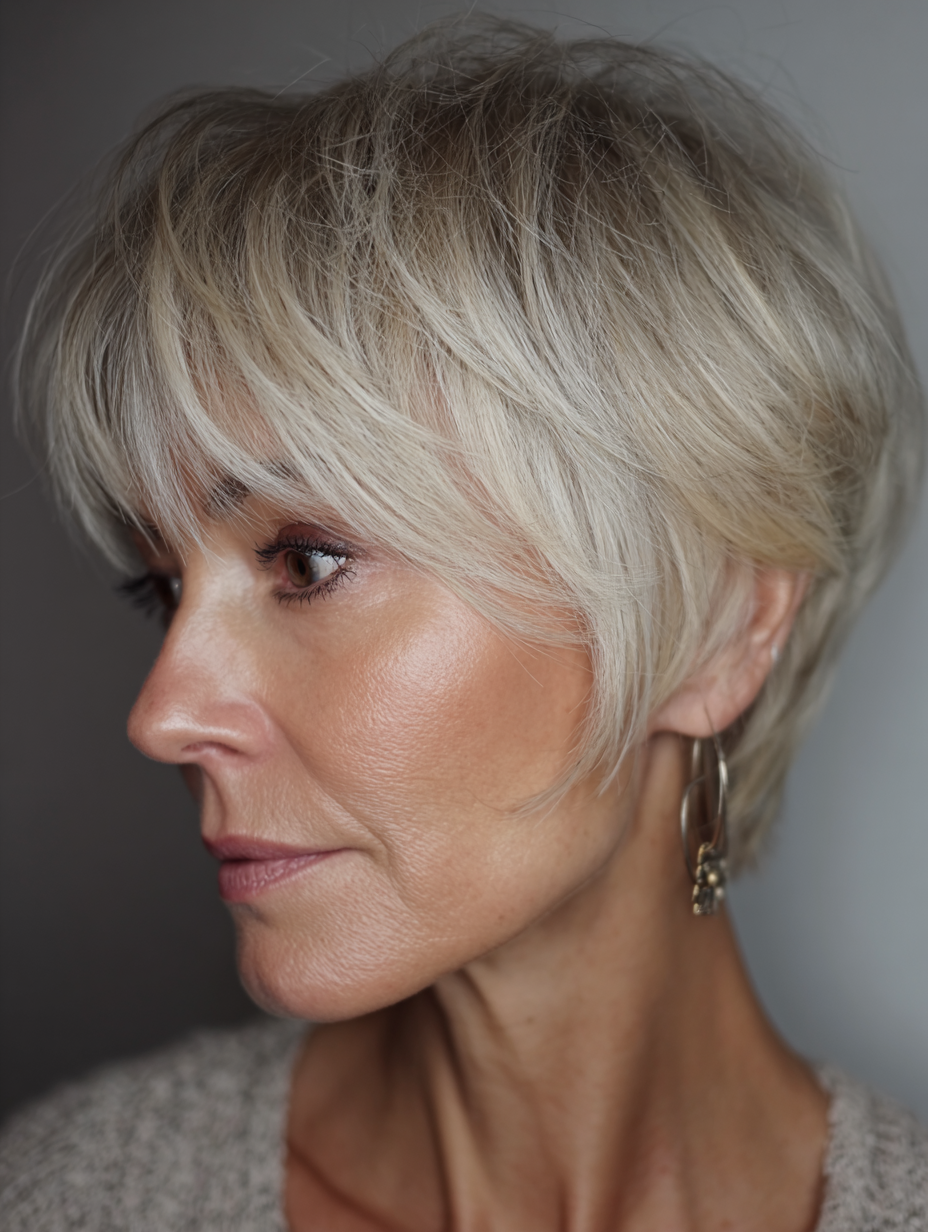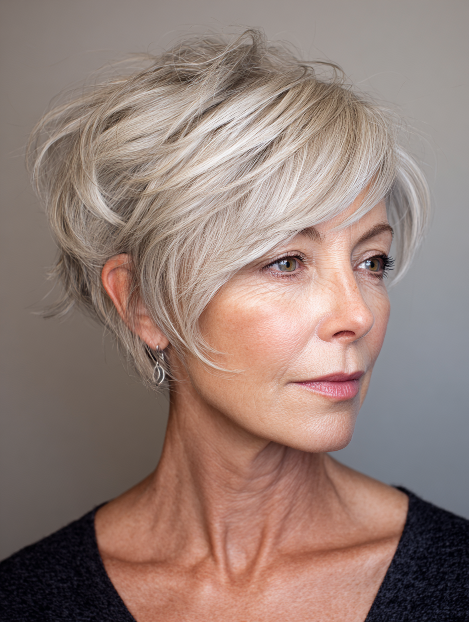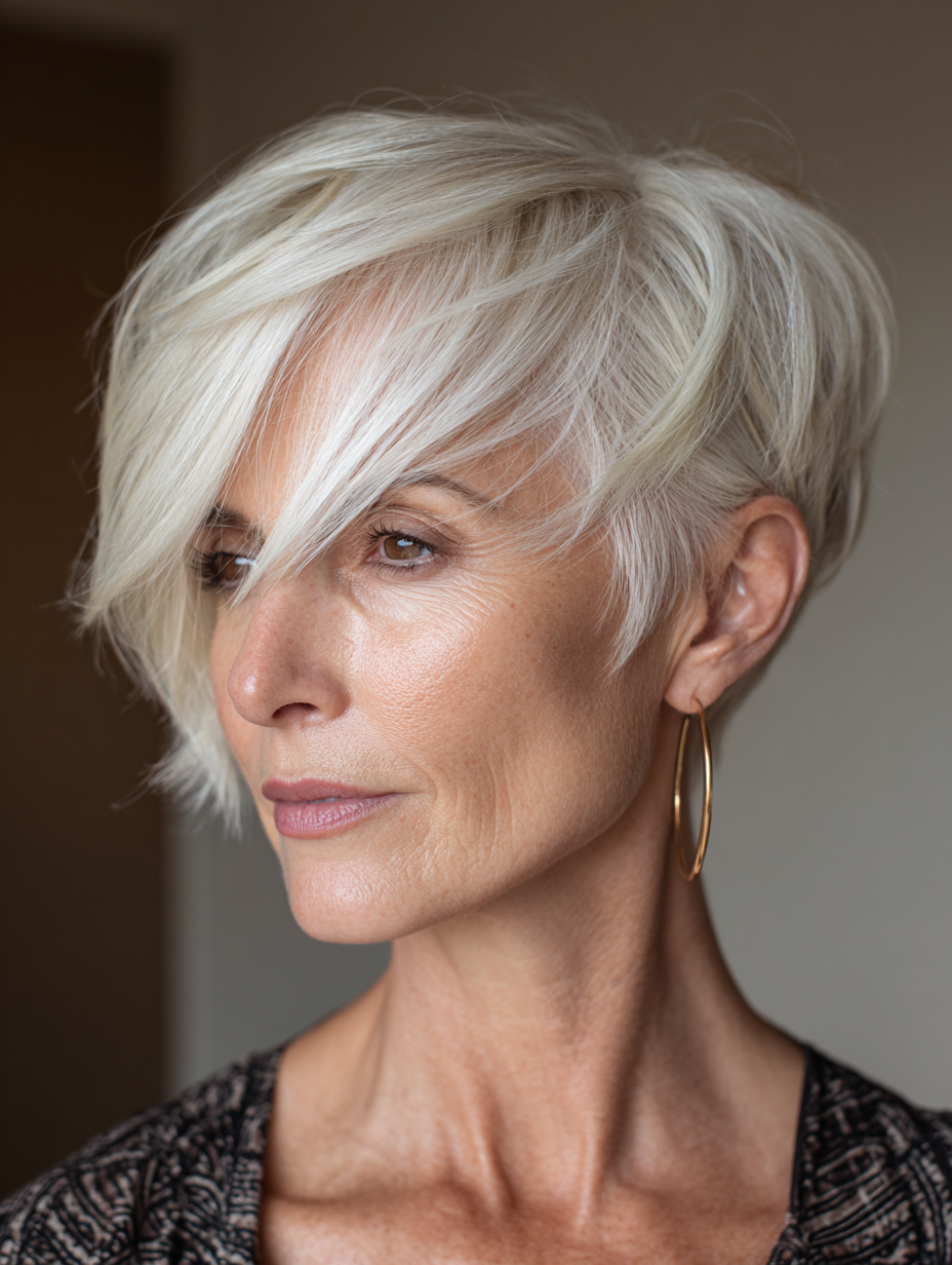 A long pixie with side bangs offers flexibility while staying easy to manage. The longer top softens facial features and allows gentle styling changes. Side bangs help balance wider foreheads and highlight the eyes. This style works well for fine to medium hair and most face shapes.