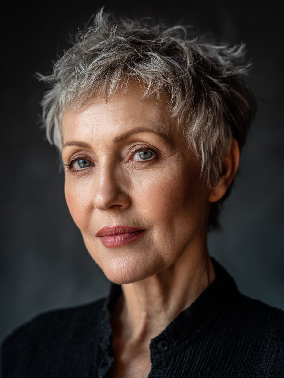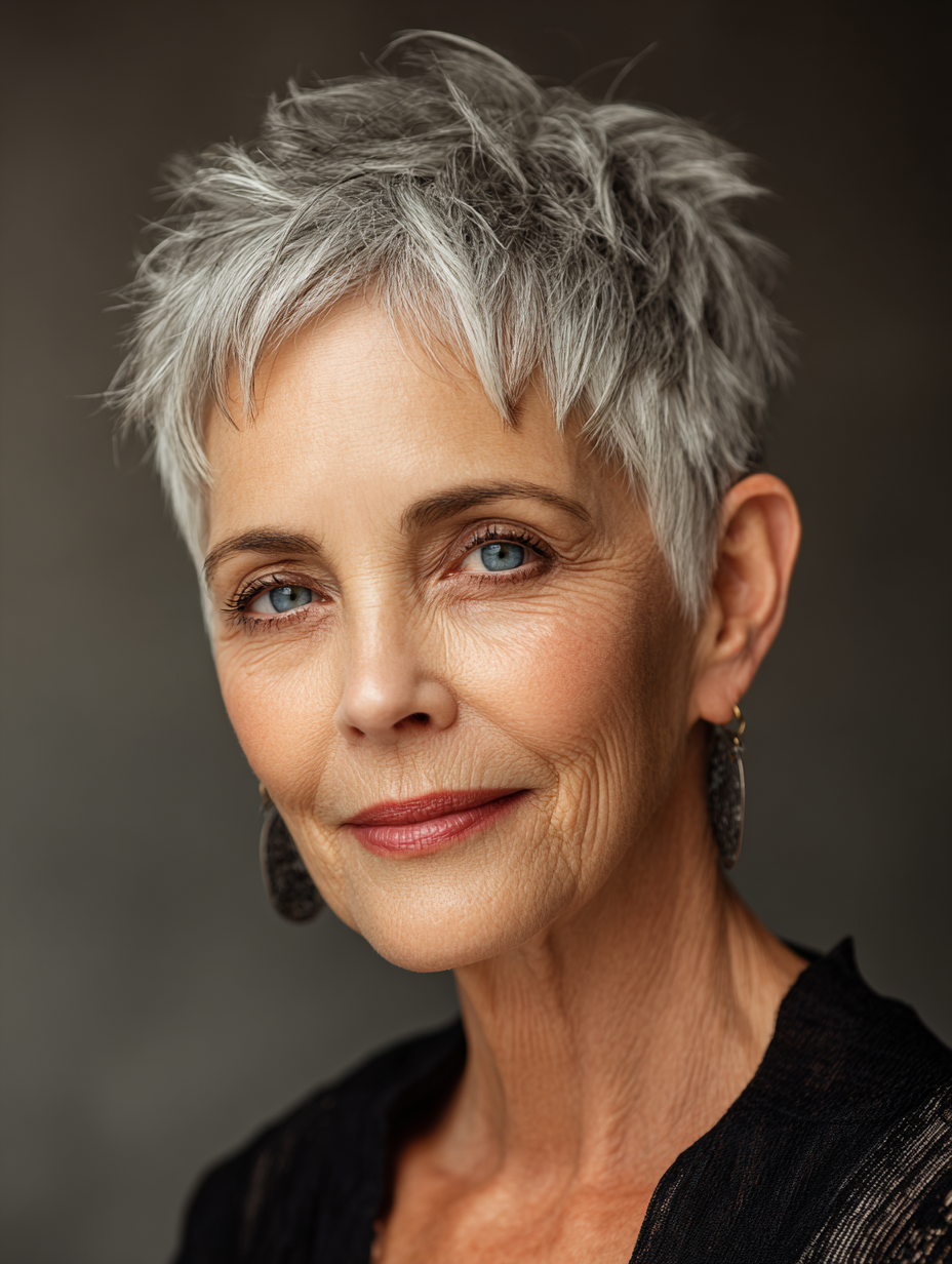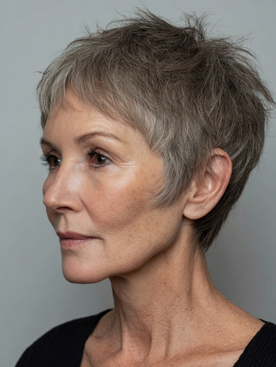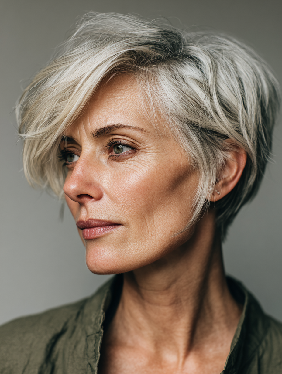 A long pixie with side bangs offers flexibility while staying easy to manage. The longer top softens facial features and allows gentle styling changes. Side bangs help balance wider foreheads and highlight the eyes. This style works well for fine to medium hair and most face shapes.