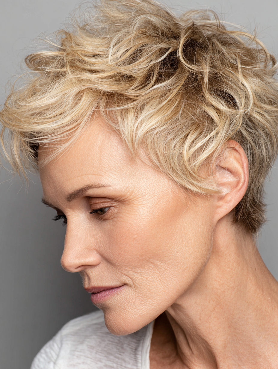 A short textured pixie keeps things easy and modern. Texture adds lift at the crown, helping hair look fuller and more balanced. This style highlights eyes and cheekbones while opening up the face. It works especially well for oval and heart shaped faces. Fine to medium hair types benefit most from this cut.