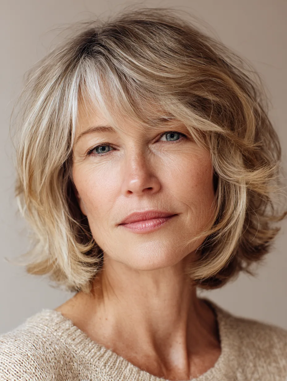 A soft layered bob offers structure without feeling heavy or strict. Layers add movement, which helps fine or thinning hair appear fuller. The length frames the face gently, softening jawlines and highlighting cheekbones. This style suits oval, round, and square faces well. It works best for straight to slightly wavy textures and stays manageable between trims.