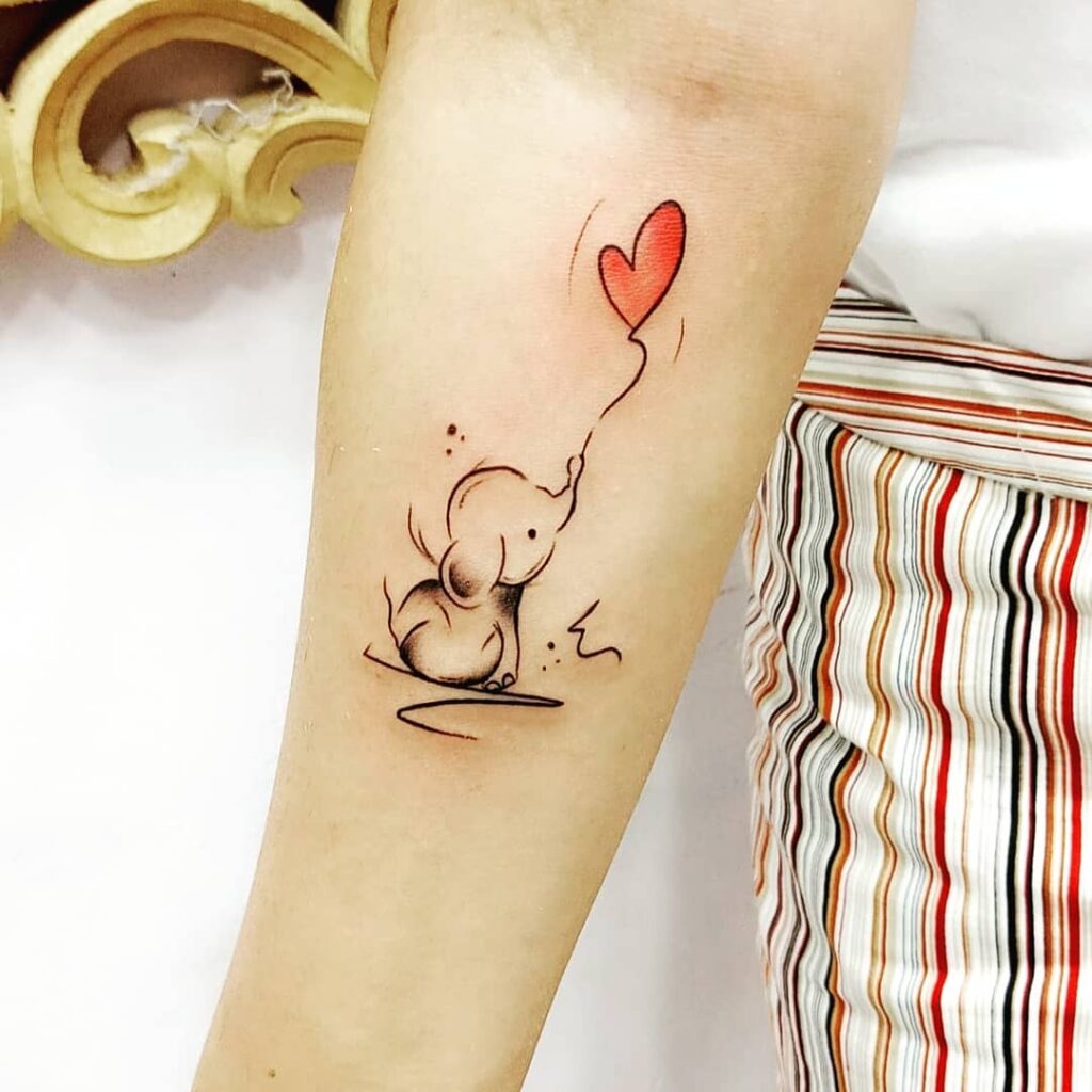 This sweet minimalist tattoo shows a tiny elephant holding a red heart-shaped balloon with its trunk. The clean, flowing lines and soft shading give it a playful, lighthearted feel. The small splashes of red add warmth and charm to the simple black ink.