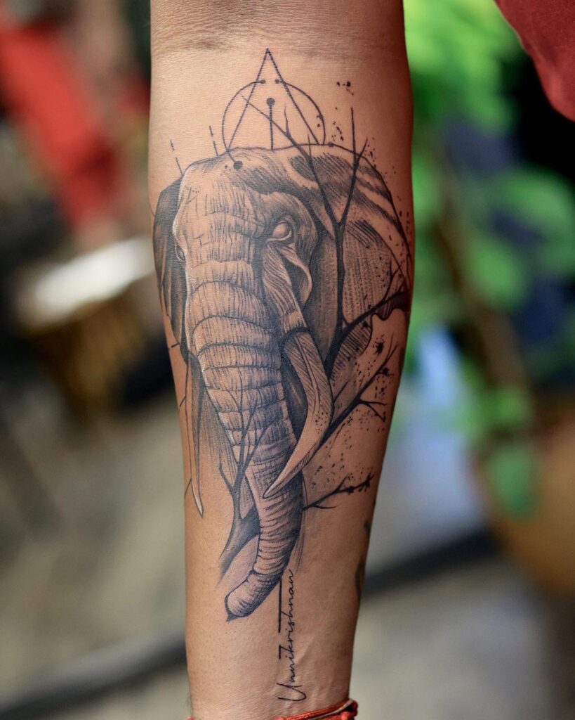 This striking forearm tattoo combines realism with geometric artistry to create a powerful elephant design. The detailed shading captures the animal’s wisdom and resilience, while clean lines and abstract shapes add modern structure.