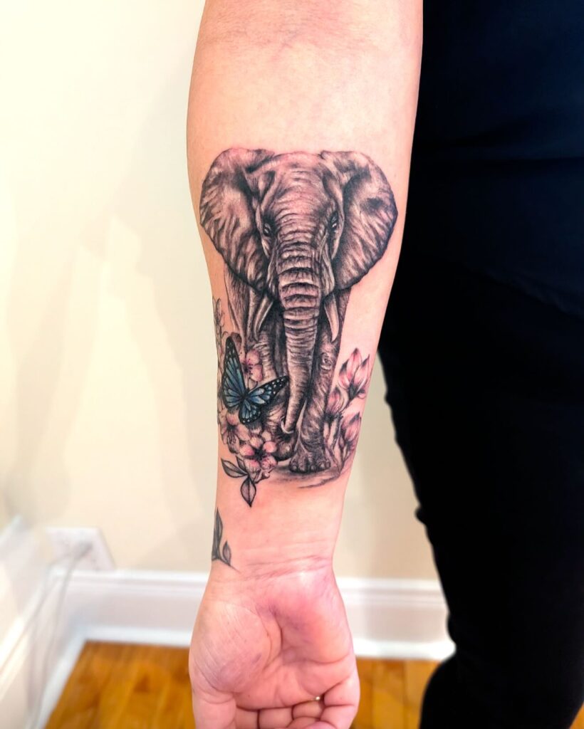 This realistic forearm tattoo captures a gentle elephant surrounded by delicate flowers and a blue butterfly. The fine shading brings the elephant’s texture and presence to life, while the butterfly adds a touch of lightness and transformation.