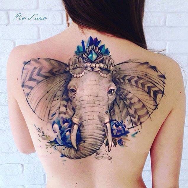 This stunning back tattoo features a majestic elephant adorned with a jeweled crown and vibrant blue accents. The artist blended watercolor effects with fine detailing, giving the piece a dreamy, ethereal feel. The elephant’s ears display delicate geometric patterns, creating a sense of symmetry and strength.