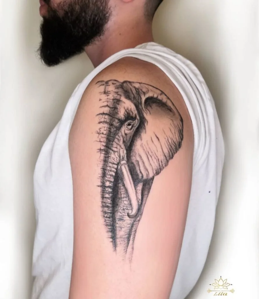 Elephants often symbolize strength, memory, and loyalty, and this design conveys those traits beautifully. Placed on the shoulder, it feels protective yet grounded — a timeless representation of wisdom carried with quiet power.