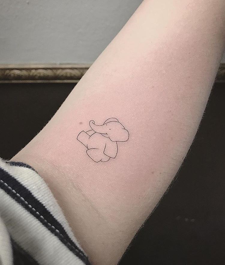 This minimalist tattoo features a small, adorable elephant drawn with clean, simple lines. The design’s charm lies in its subtlety — no shading, just a soft outline that captures the elephant’s gentle personality. It feels lighthearted yet meaningful, symbolizing kindness, loyalty, and calm strength.