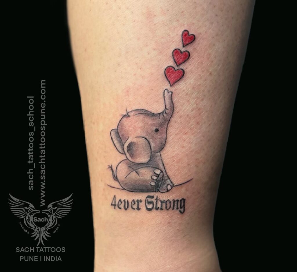 This adorable tattoo shows a small baby elephant sitting peacefully with its trunk raised, releasing three red hearts. The soft shading and simple lines give the elephant a warm, innocent look. Below it, the phrase “4ever Strong” adds a touching message of resilience and love.