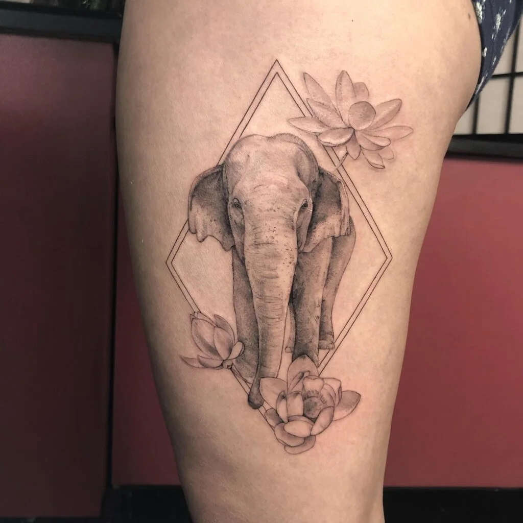 This elegant thigh tattoo features a realistic elephant framed within fine geometric lines, surrounded by soft lotus blossoms. The artist used delicate shading to capture the elephant’s calm and wise expression, creating a sense of balance and strength.