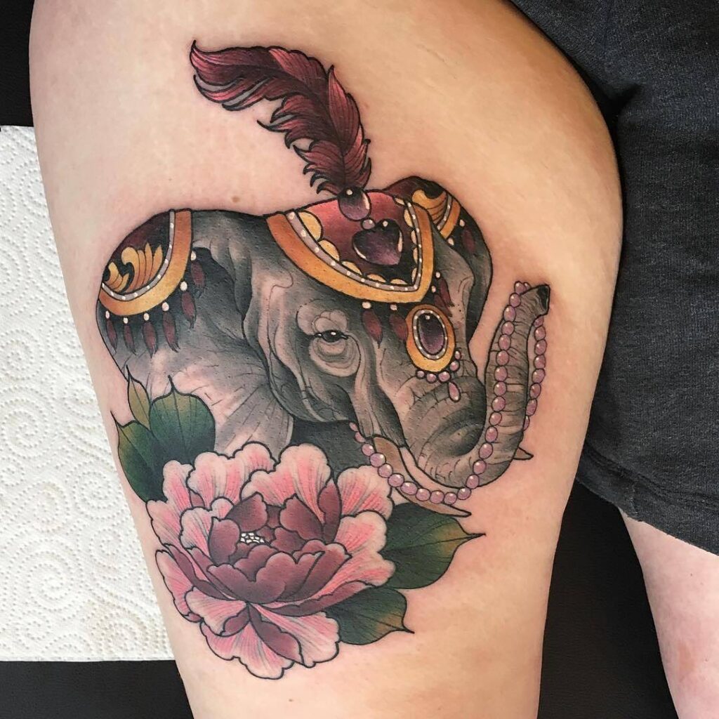 This colorful thigh tattoo showcases a regal elephant adorned with ornate jewelry, rich gold accents, and a deep red feathered headdress. A large pink peony blooms beneath, adding softness and contrast to the design’s royal energy. The detailed beadwork and jewel tones create a luxurious, almost ceremonial feel.