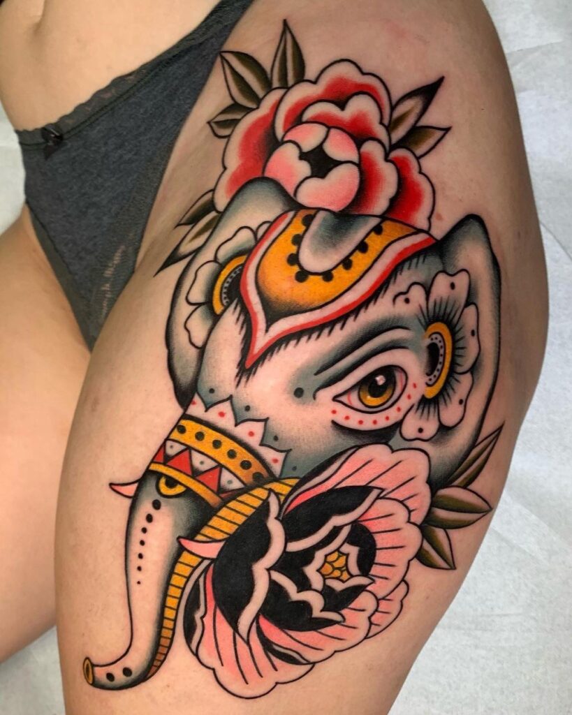 This bold traditional-style tattoo features a decorated elephant surrounded by vibrant flowers in red, pink, and black. The artist used thick black outlines and rich colors to create strong contrast and timeless appeal.