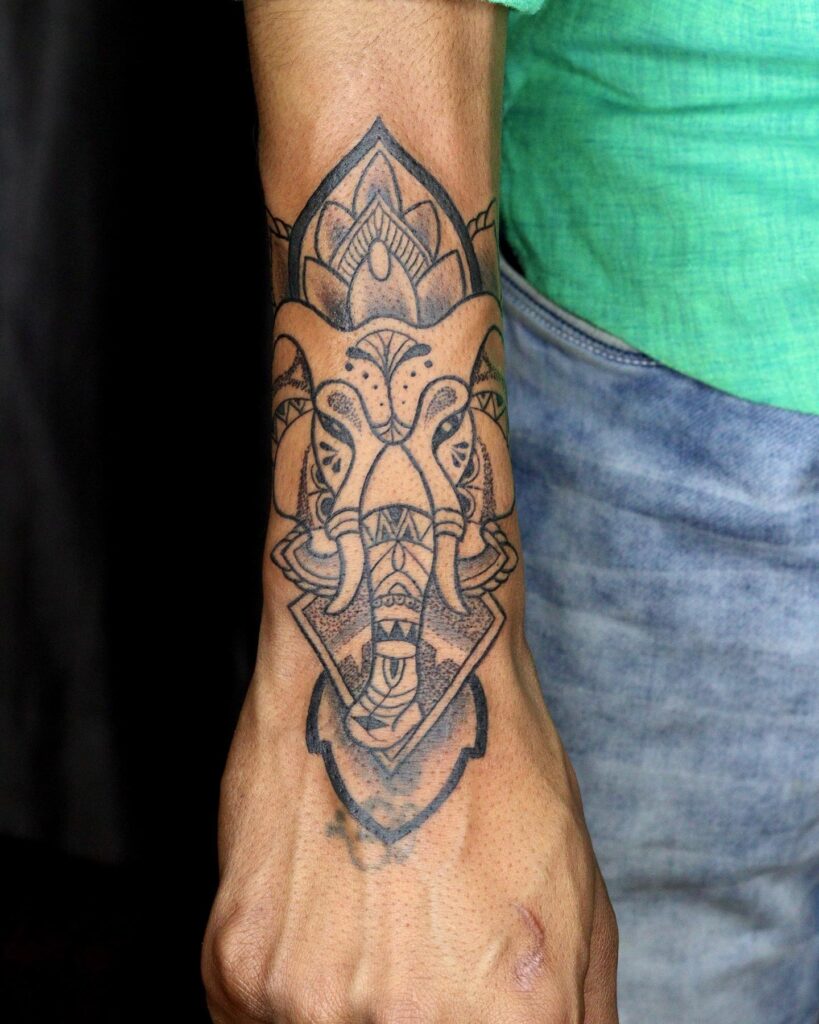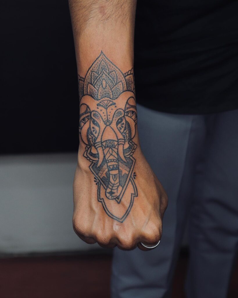 This detailed hand tattoo features a symmetrical elephant head framed by intricate mandala-inspired patterns. The artist used clean black lines and dotwork to create depth and precision. The geometric shapes above the elephant’s head symbolize focus and inner peace, while the animal itself represents strength and wisdom.