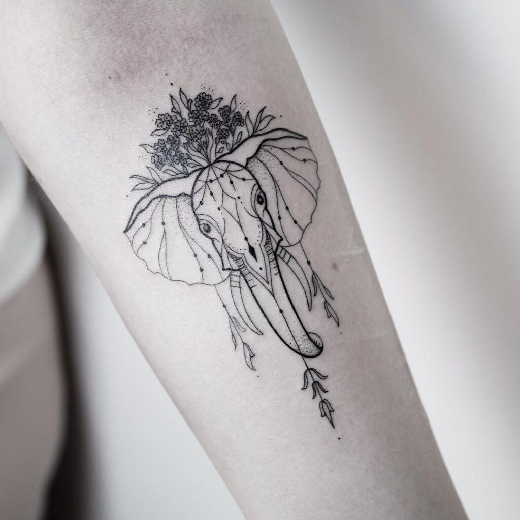 This delicate black ink tattoo features an elegant elephant head adorned with blooming flowers. The artist used fine lines and soft dotwork to create a graceful, airy look. The floral arrangement above the elephant’s head symbolizes peace and growth, while the minimalist detailing gives it a modern, refined touch.