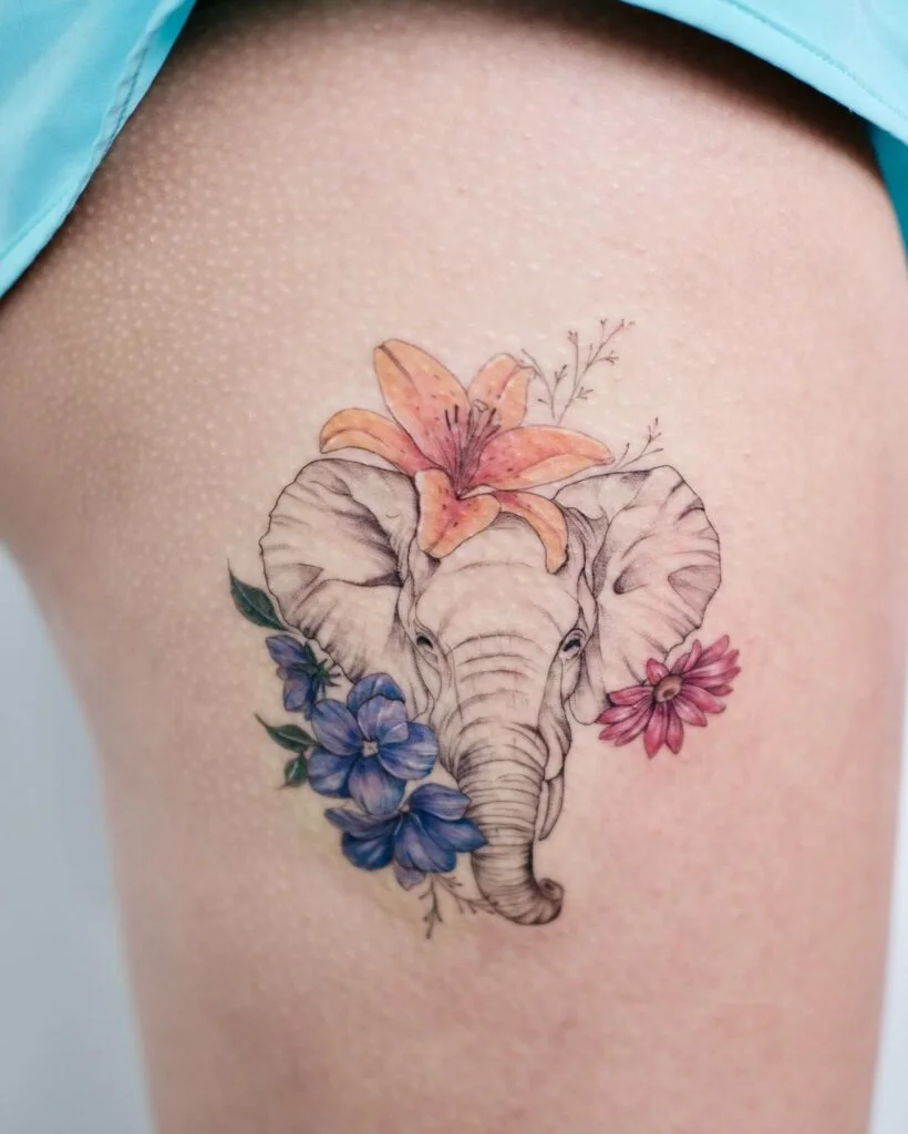 This charming thigh tattoo features a soft, realistic elephant head adorned with bright, delicate flowers. A vivid orange lily rests gracefully between its ears, symbolizing confidence and positivity. Blue and pink blossoms frame the elephant, adding balance and a touch of femininity.