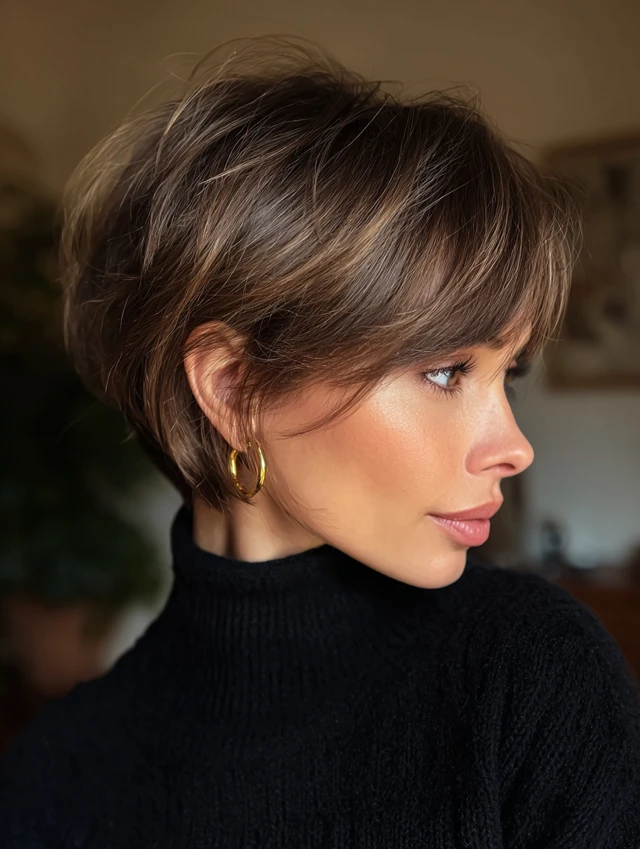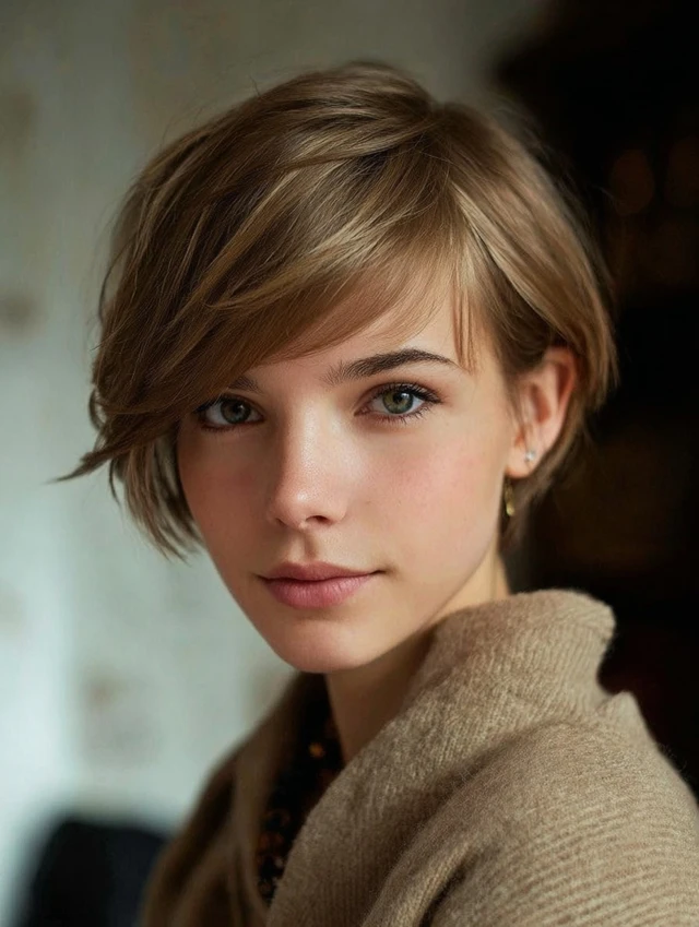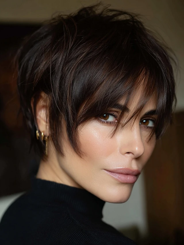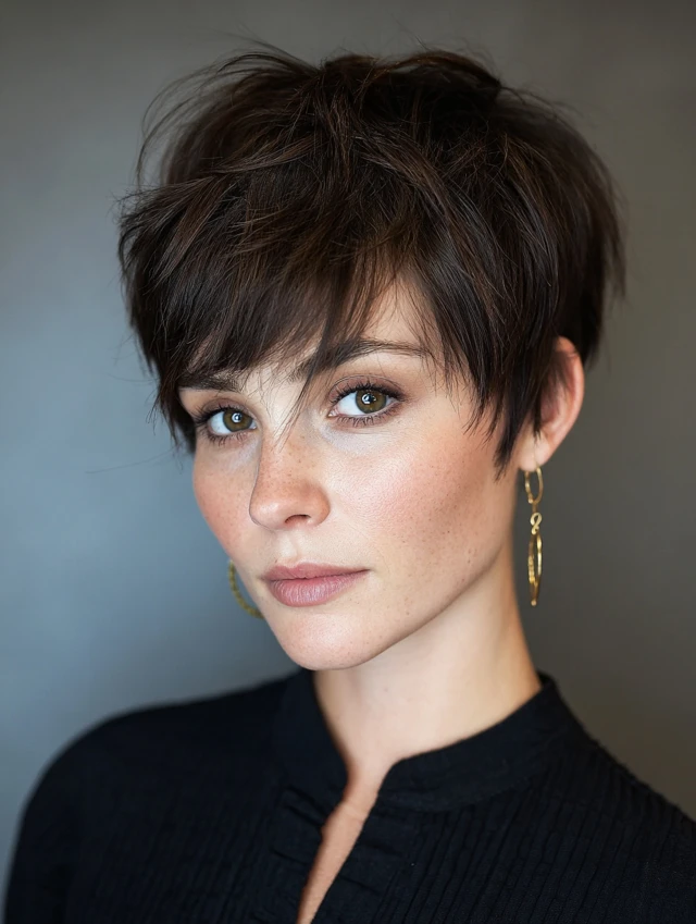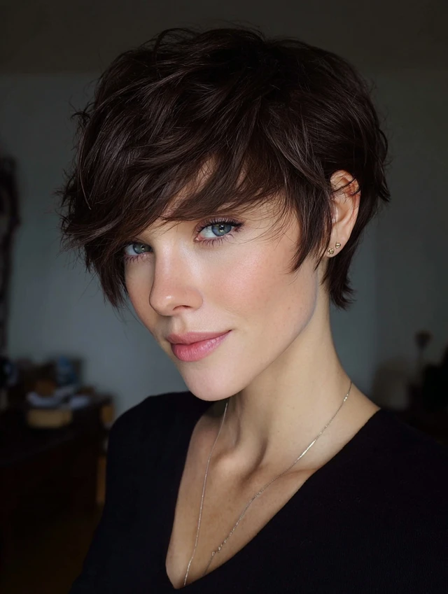 A layered pixie with longer front sections adds lift and direction. The longer pieces frame the cheekbones and soften the forehead. This cut suits oval and heart-shaped faces. Fine to medium hair benefits from the added texture.