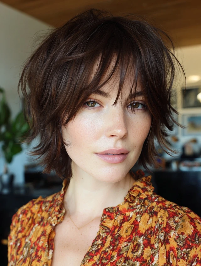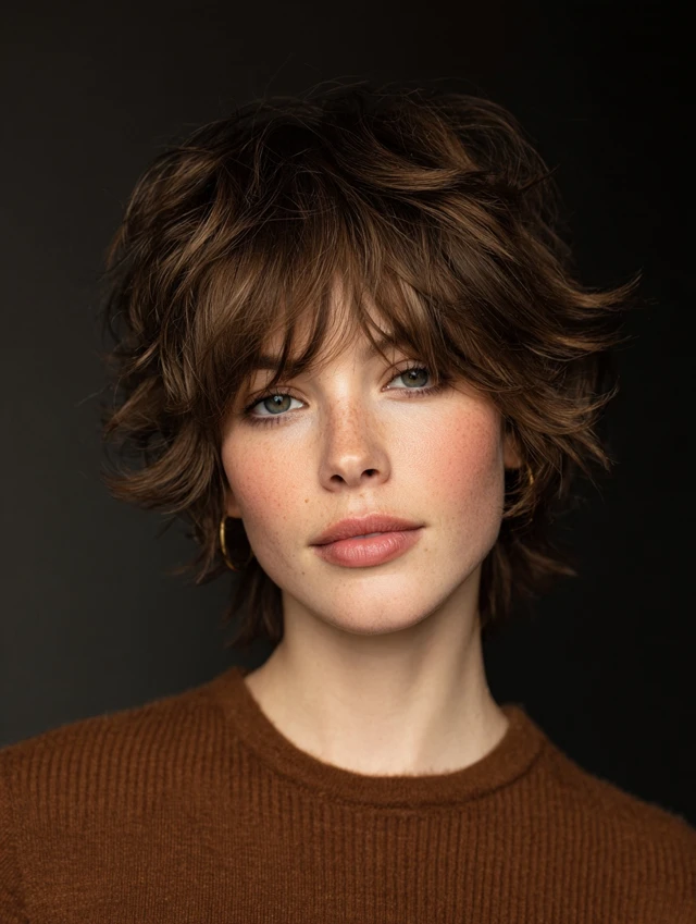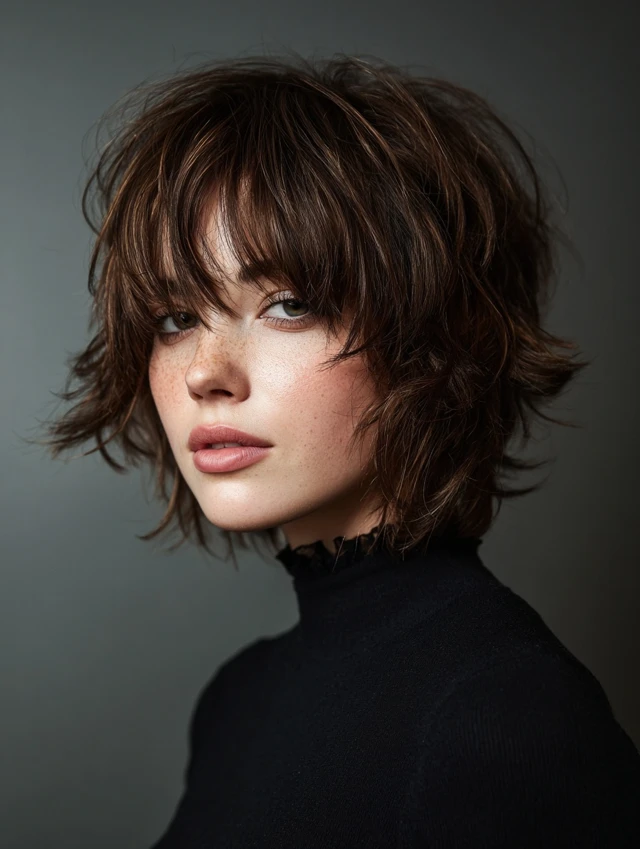A short shag with curtain fringe builds volume at the crown. The fringe frames the forehead and cheek area gently. This style suits heart and oval face shapes. Medium to thick textures hold the layers well.